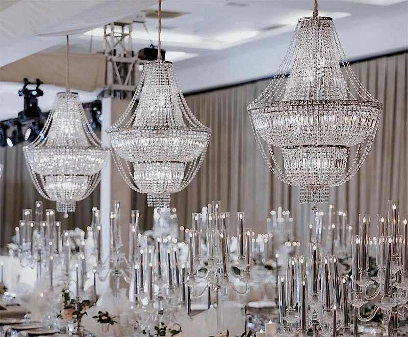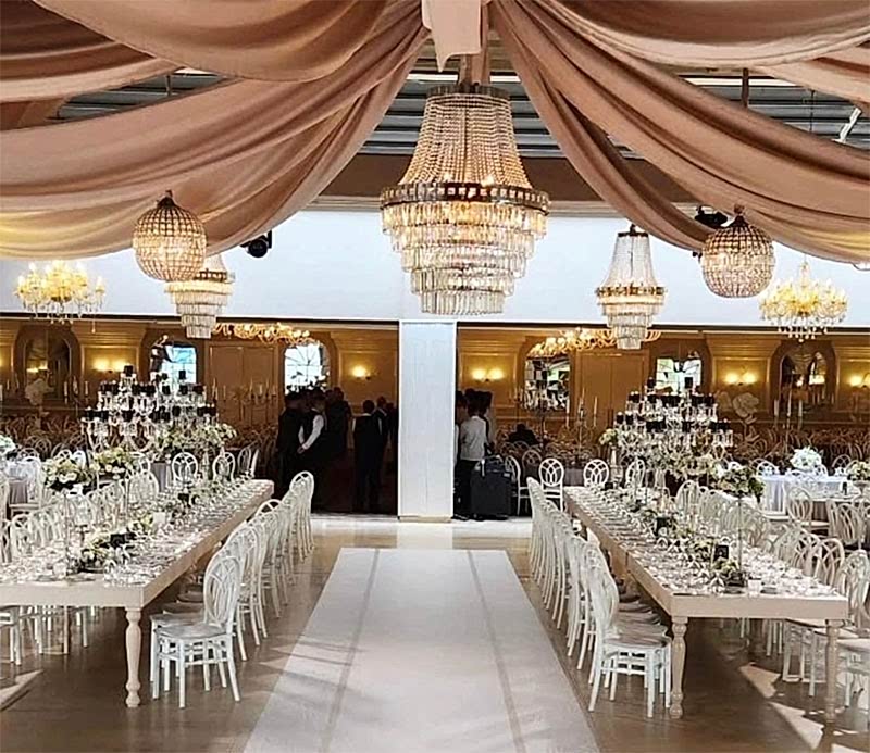 Özellikle düğün ve nikâh organizasyonlarında kristal görünümlü avizeler romantik bir atmosfer oluştururken, kurumsal etkinliklerde daha modern tasarımlar tercih edilebilir.